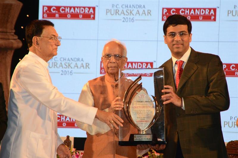 Mr. Vishwanathan Anand (2016) – Left to right: Shri Binoy Kumar Chandra, Shri Keshari Nath Tripathi (Governor of West Bengal) and Mr. Vishwanathan Anand (Puraskaar recipient, Indian chess grandmaster)