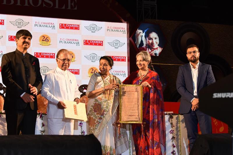Asha Bhosle (2018) – Left to right: Shri Amitava Chandra, Shri A. K. Chandra, Smt Asha Bhosle (Puraskaar recipient), Smt Sharmila Tagore (Veteran Indian Actress) and Shri Prosenjit Chandra