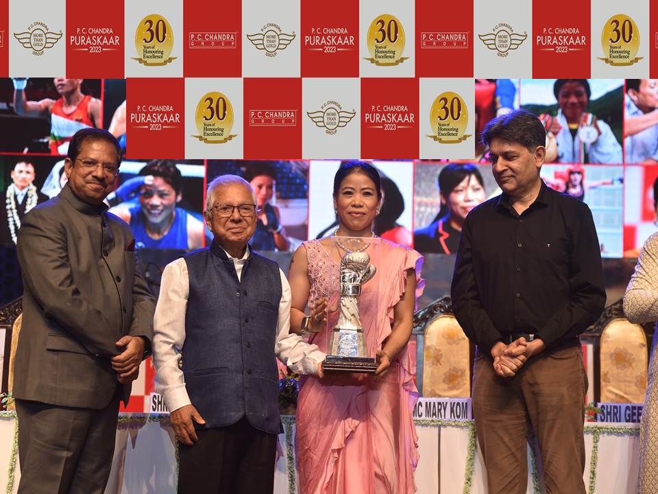 MC Mary Kom (2023): Left to right – Shri Prosanto Chandra, Shri A. K. Chandra, MC Mary Kom (Puraskaar recipient), and Mr. Geet Sethi (Billiards World Champion)