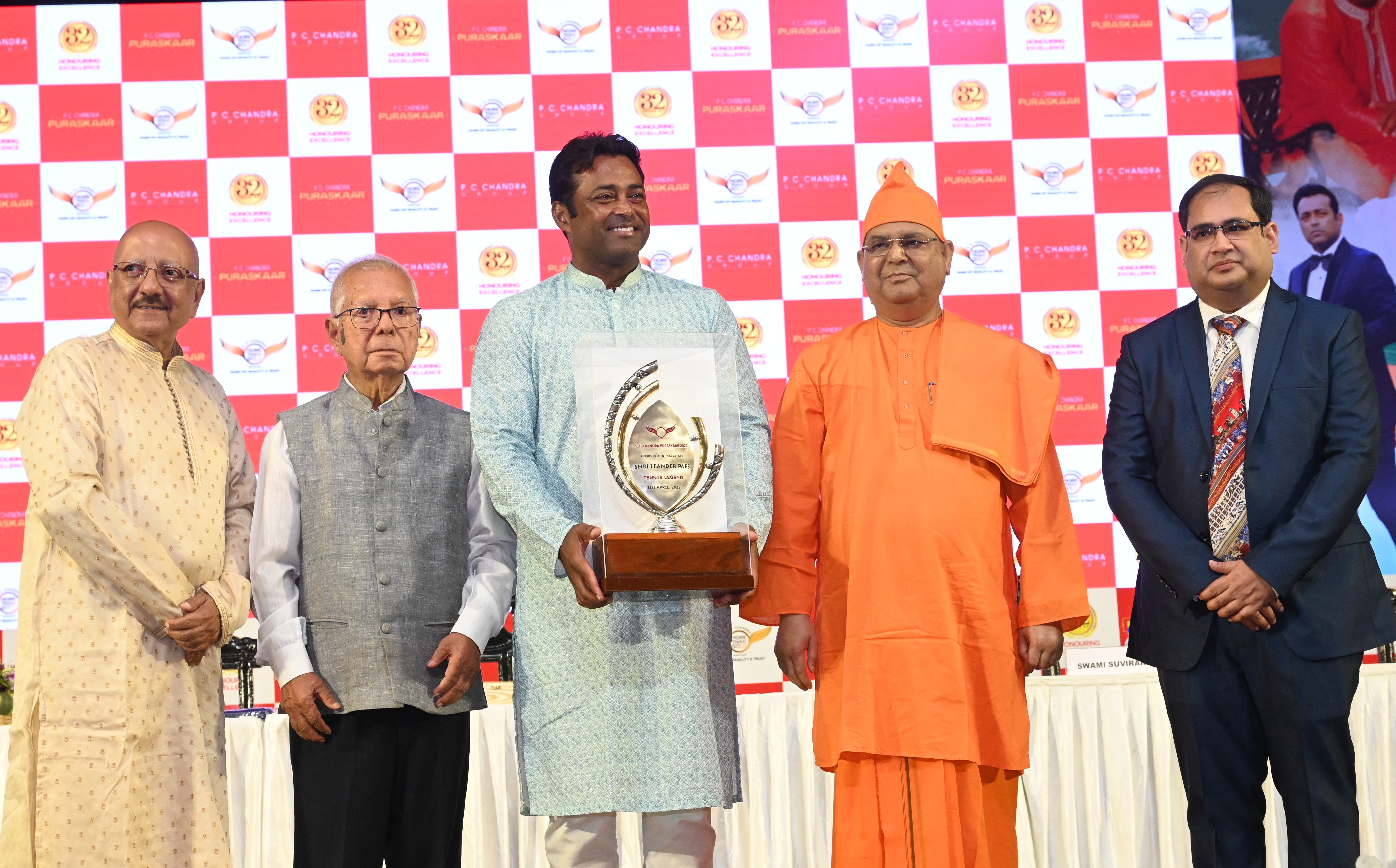 Shri Laender Paes (2025): Left to right – Shri Uday Kumar Chandra, Shri Arun Kumar Chandra, Shri Leander Paes (Puraskaar recipient), Swami Suvirananda, and Shri Abhijit Laha