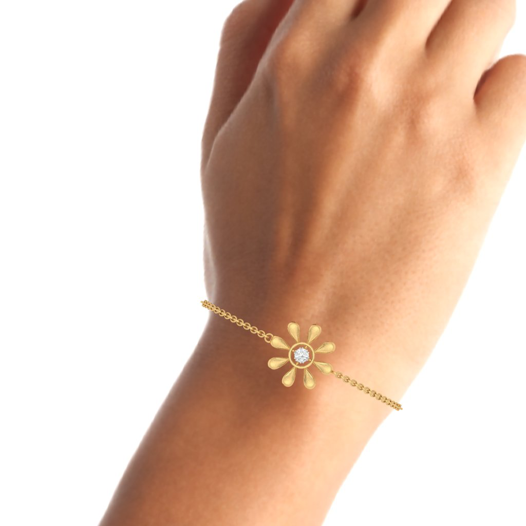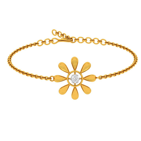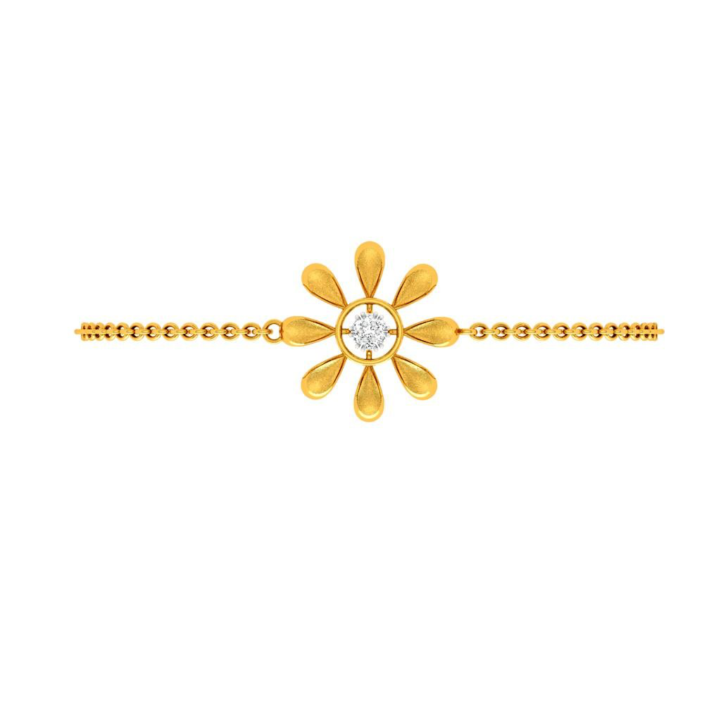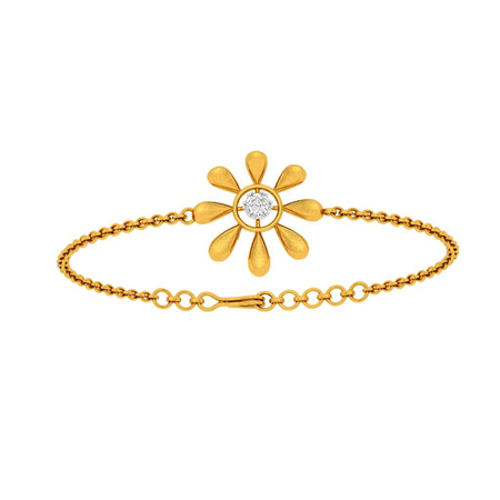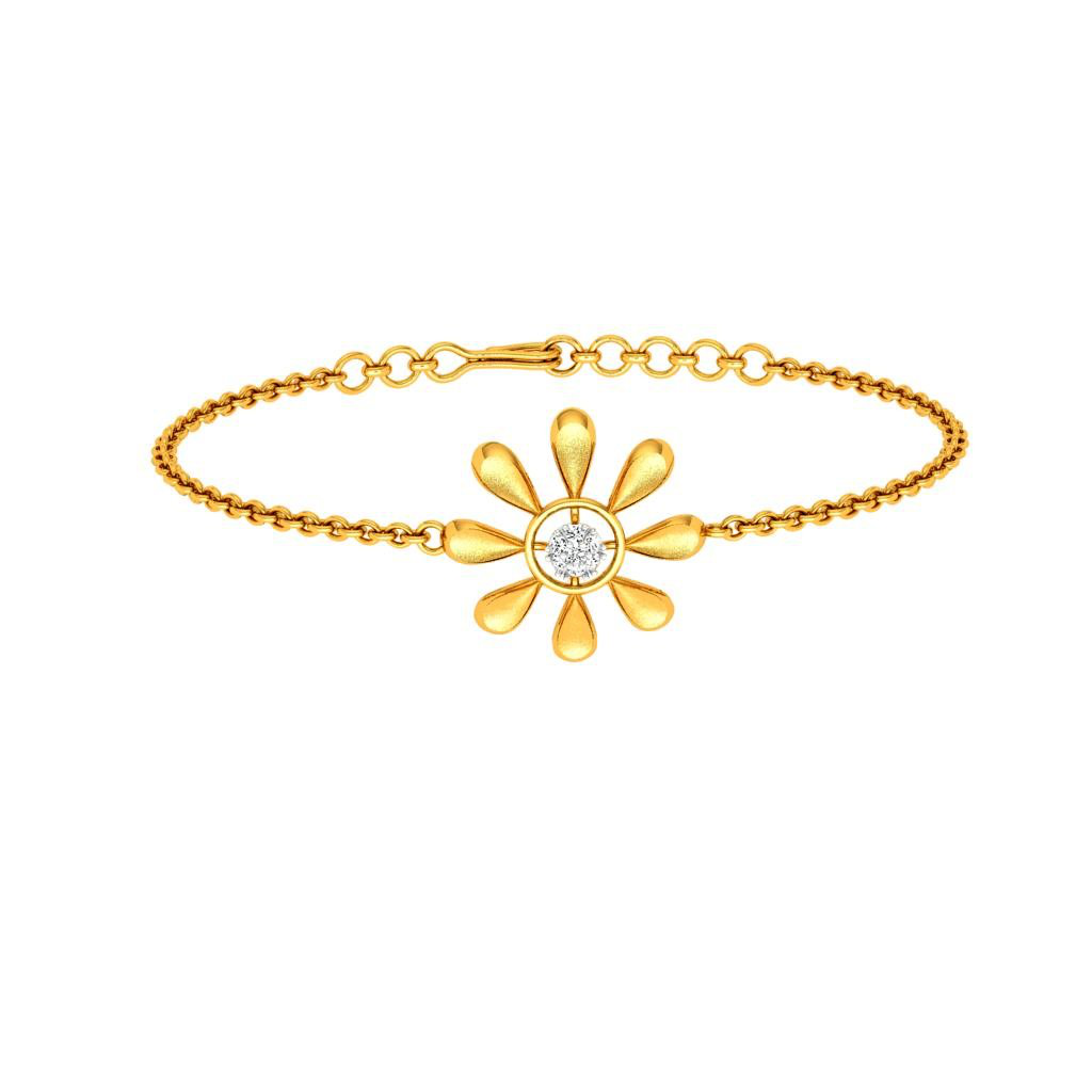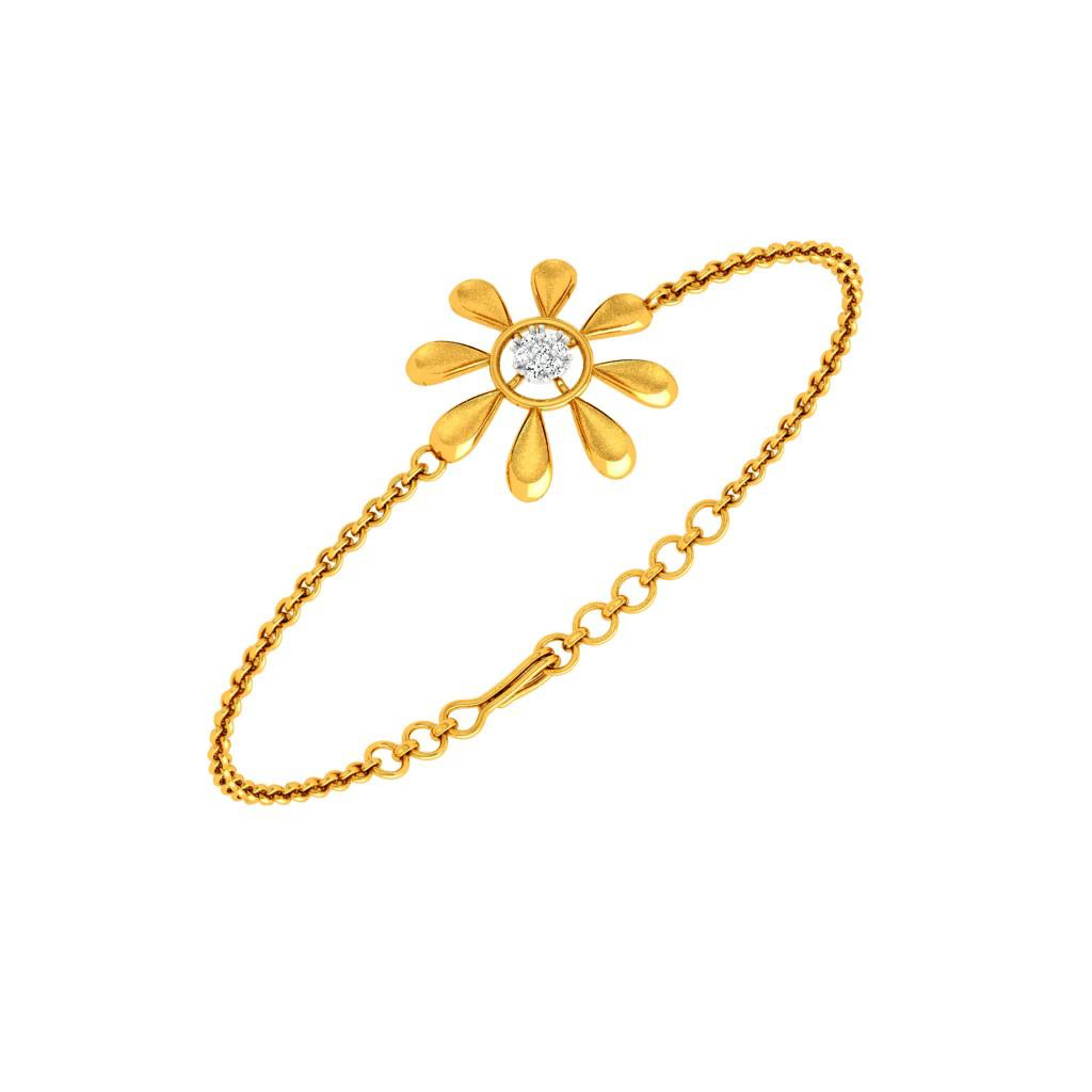 The 18K floret gold bracelet has a dimension of 4.5cm*5.6cm*4.5cm and weights 3gms. The bracelet has 0.05CT diamond embedded in it that has SGL/EGL/PCC CERTIFICATION and is made up of BIS hallmark gold.