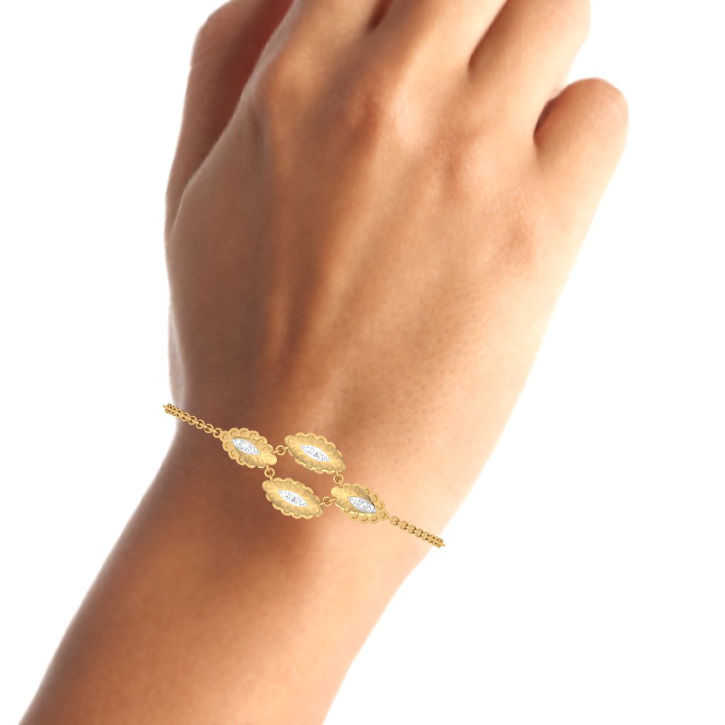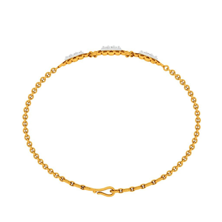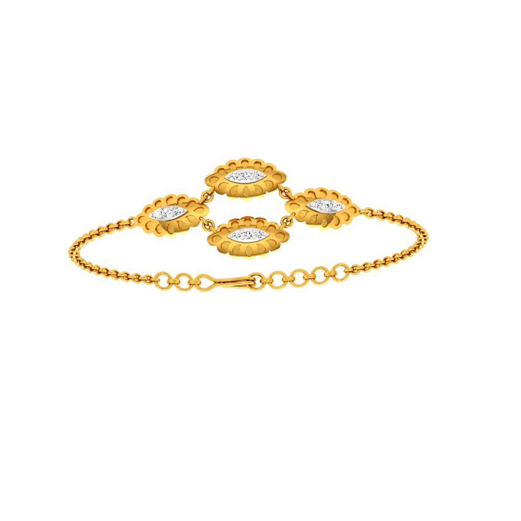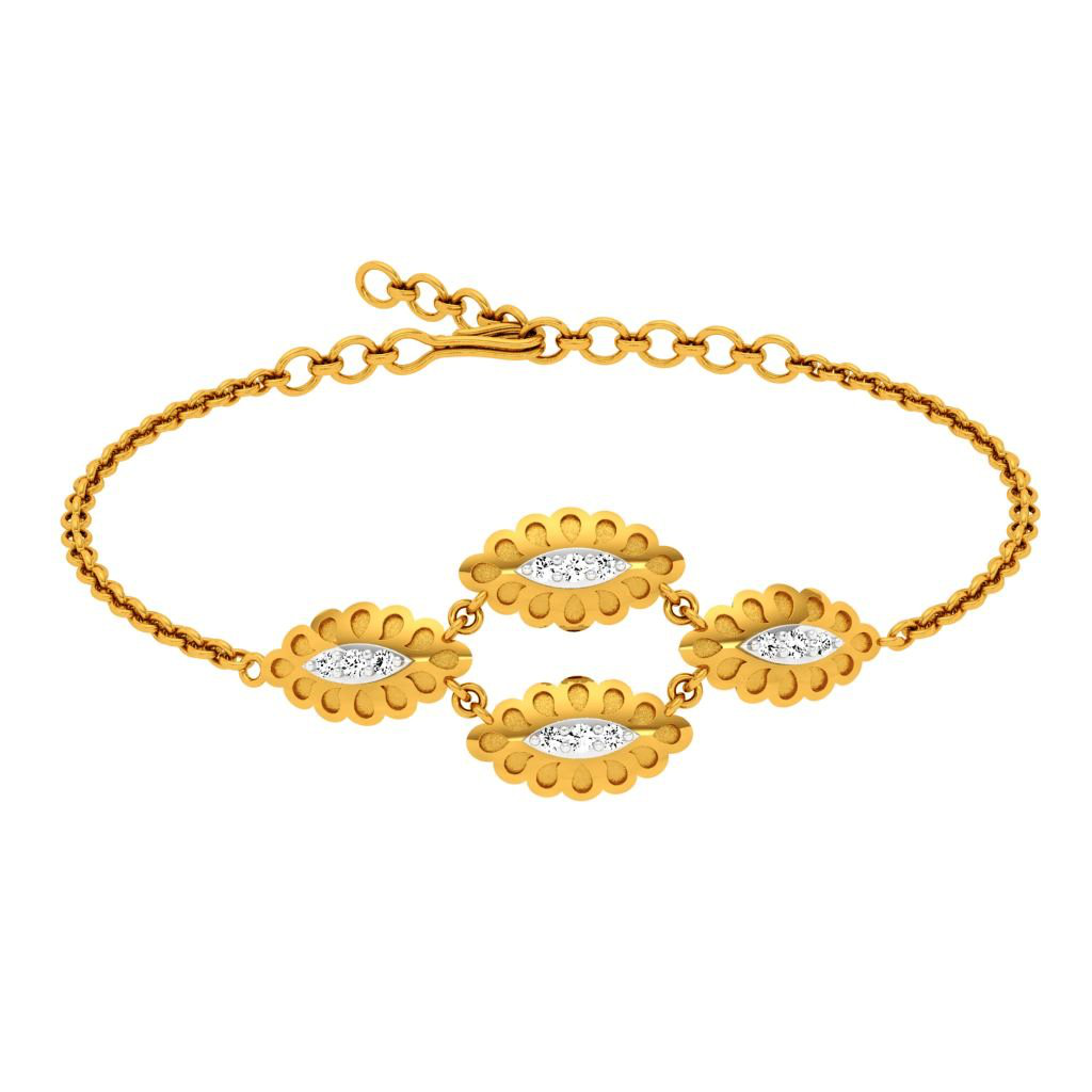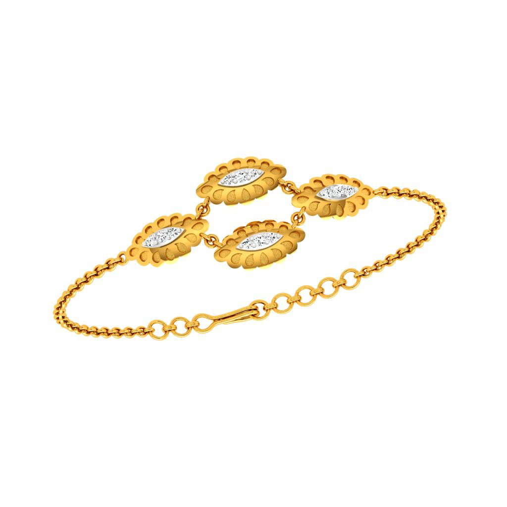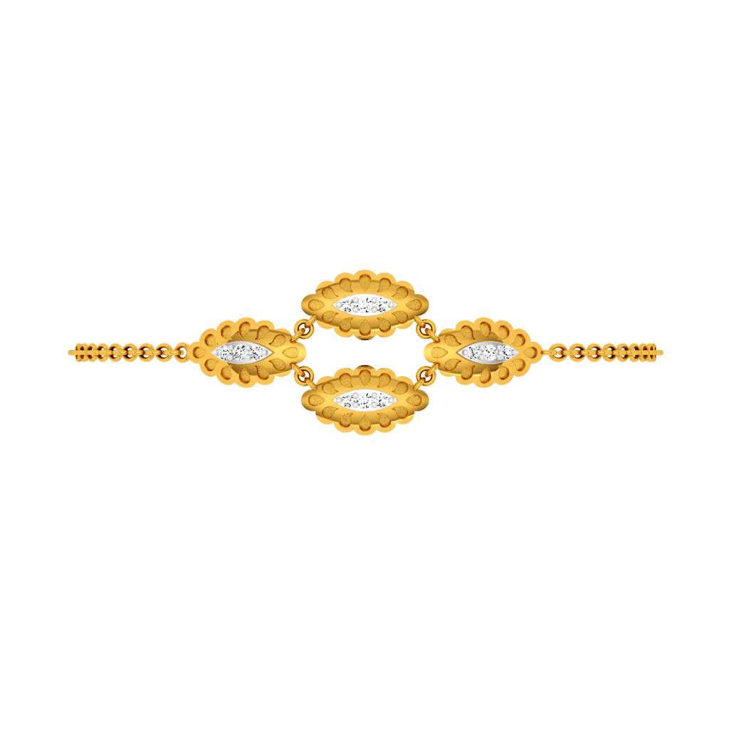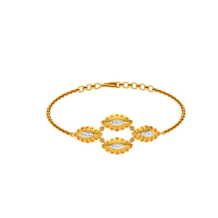 The bracelet has four oval shapes chained together and has 0.14CT diamonds studded in it. The 18K gold bracelet design is apt for any private party or small occasion and weights as light as 3.5gms. The bracelet has a dimension of 4.5cm*5.6cm*4.5cm and com