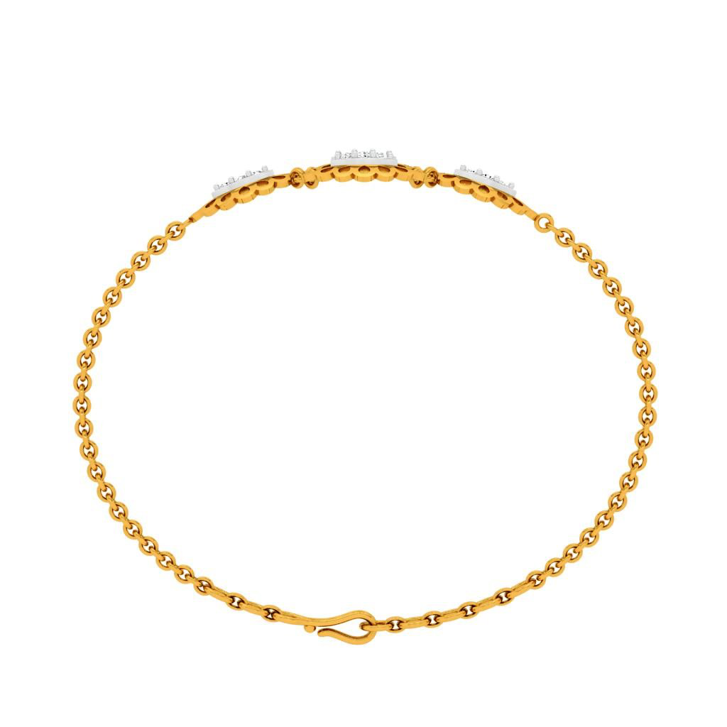 The bracelet has four oval shapes chained together and has 0.14CT diamonds studded in it. The 18K gold bracelet design is apt for any private party or small occasion and weights as light as 3.5gms. The bracelet has a dimension of 4.5cm*5.6cm*4.5cm and comes with BIS hallmark and SGL/EGL/PCC CERTIFICATION for gold and diamond authentication.