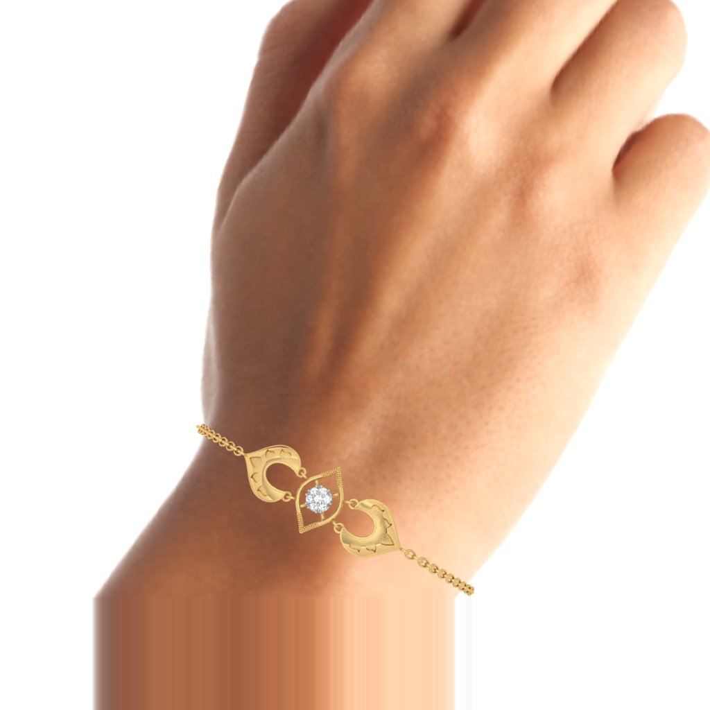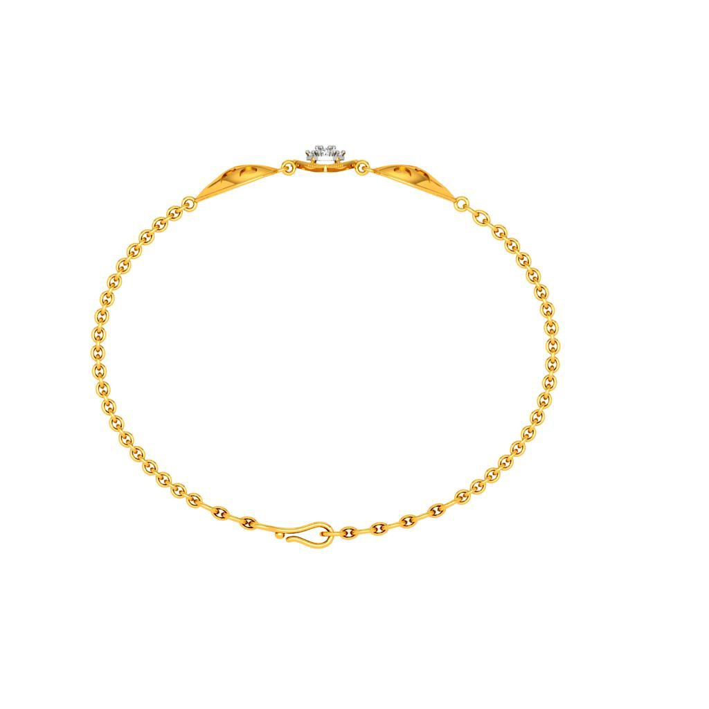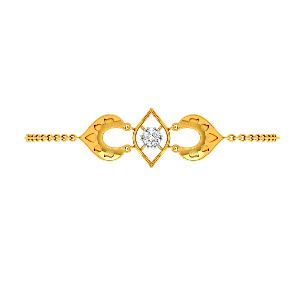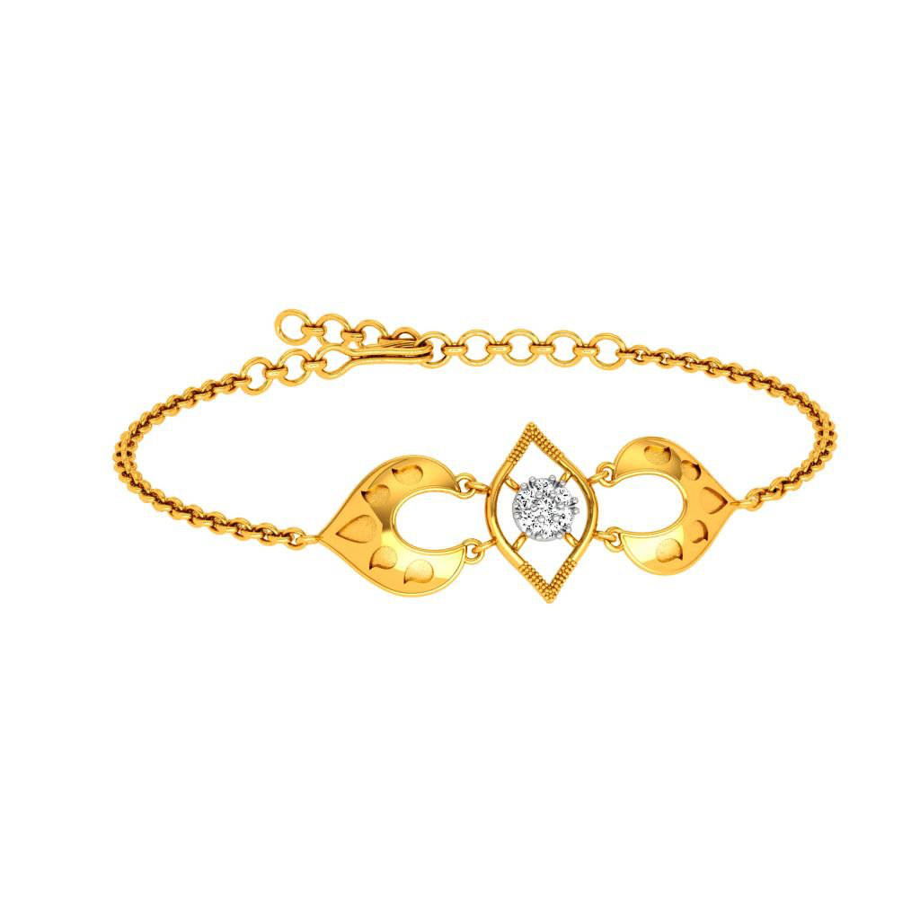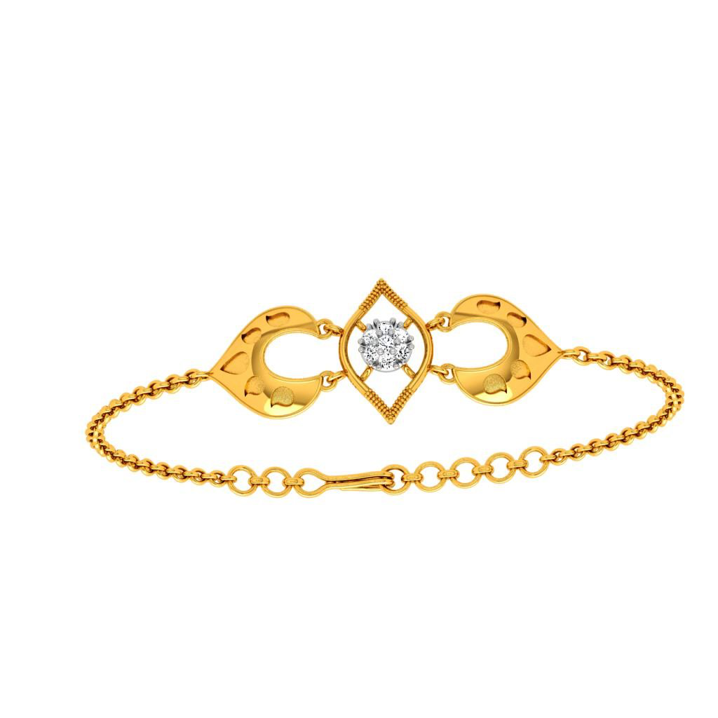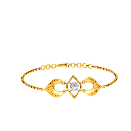 The bracelet is oval shaped studded with 0.09CT diamond and has steep ends extended with thin chain. The 18K diamond bracelet has a dimension of 4.5cm*5.6cm*4.5cm that is made up of BIS hallmark gold and weights 3.25gms. The diamond embedded in the gold bracelet for girls comes with SGL/EGL/PCC CERTIFICATION.