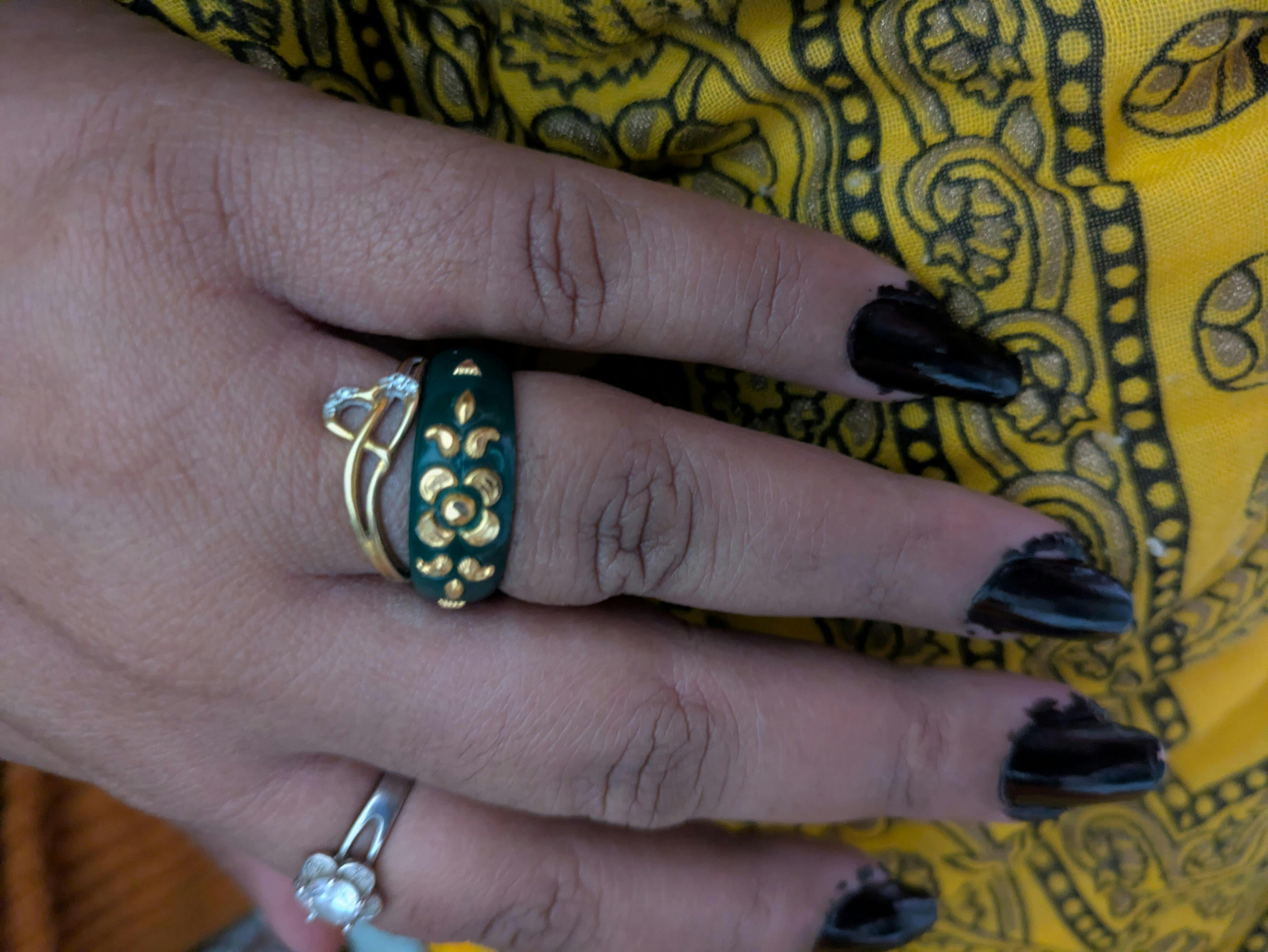 Explore the 22K Green Pola Gold Ring with Floral Embellishments at PC Chandra Jewellers. A blend of 22K gold and green pola, perfect for adding elegance and charm to your collection.