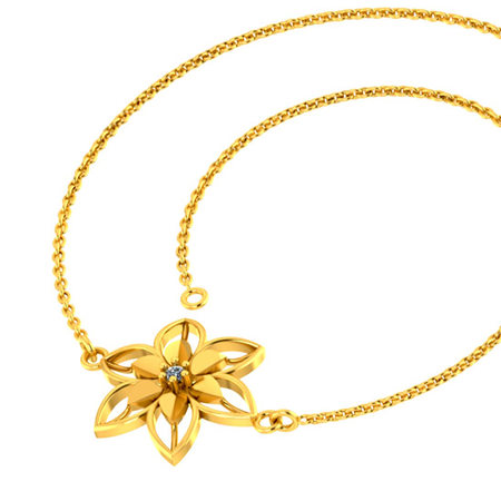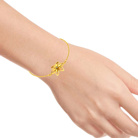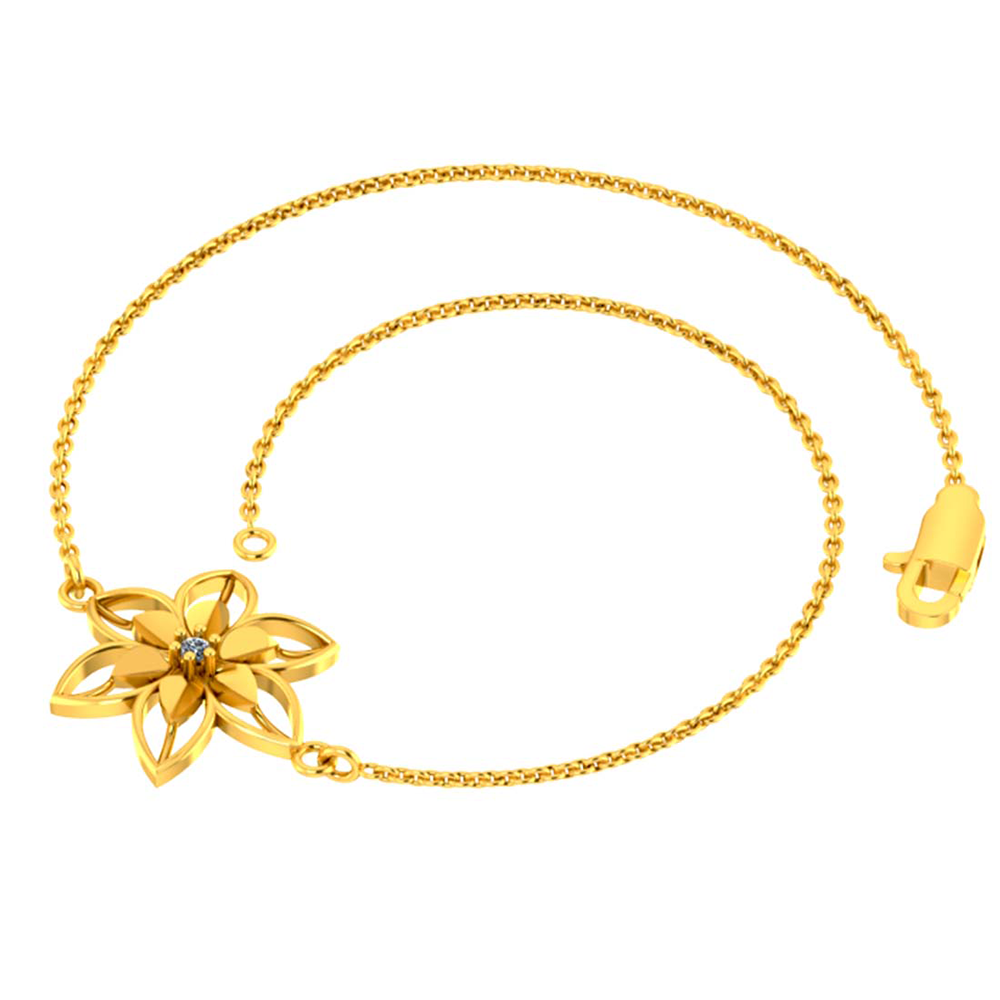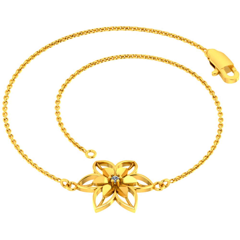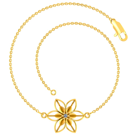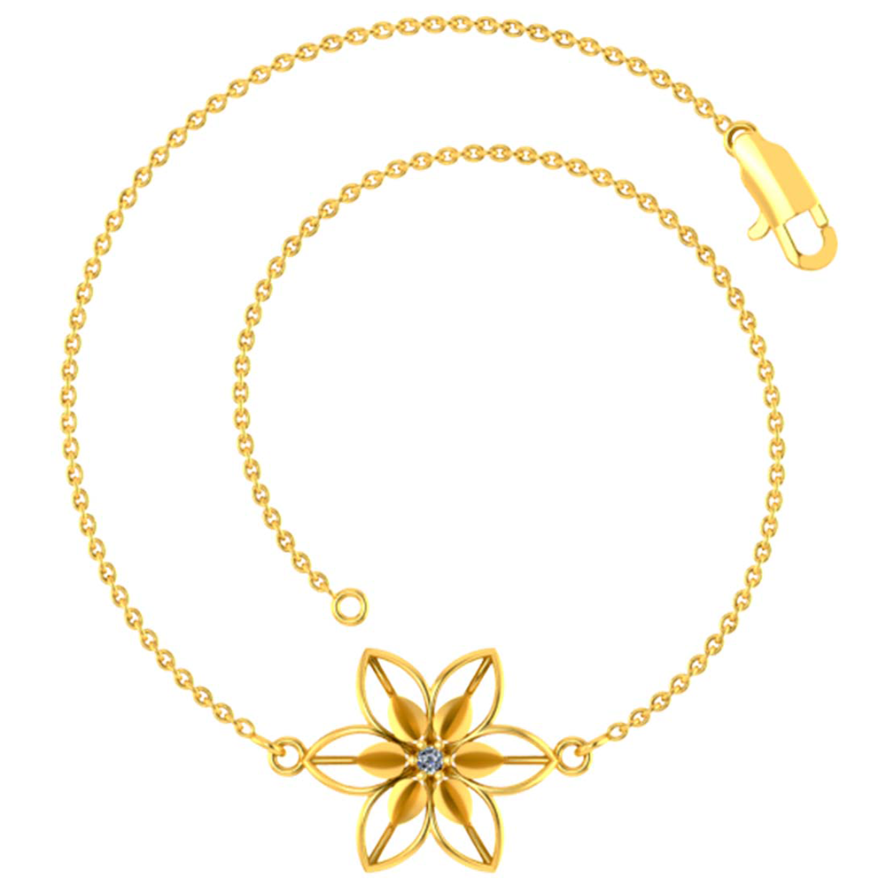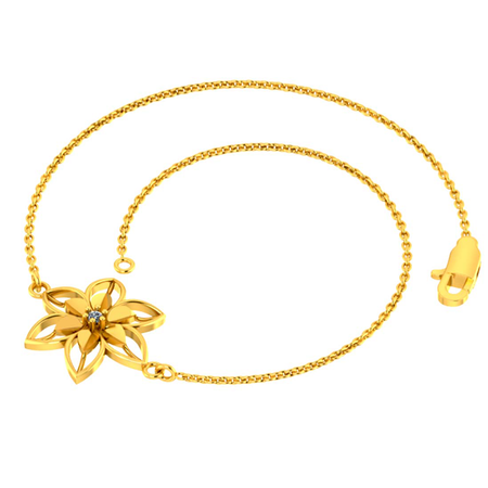 The 18K flower motif diamond adorn gold bracelet is crafted in a beautiful flower pattern. The precious diamond bracelet is specially designed for women. Give your loved one this special solitaire diamond piece of jewellery and watch their face light up.\ This light weight diamond jewellery carries a BIS hallmark Certification for the gold?s purity and authenticity and SGL/EGL for the diamond?s authenticity.\